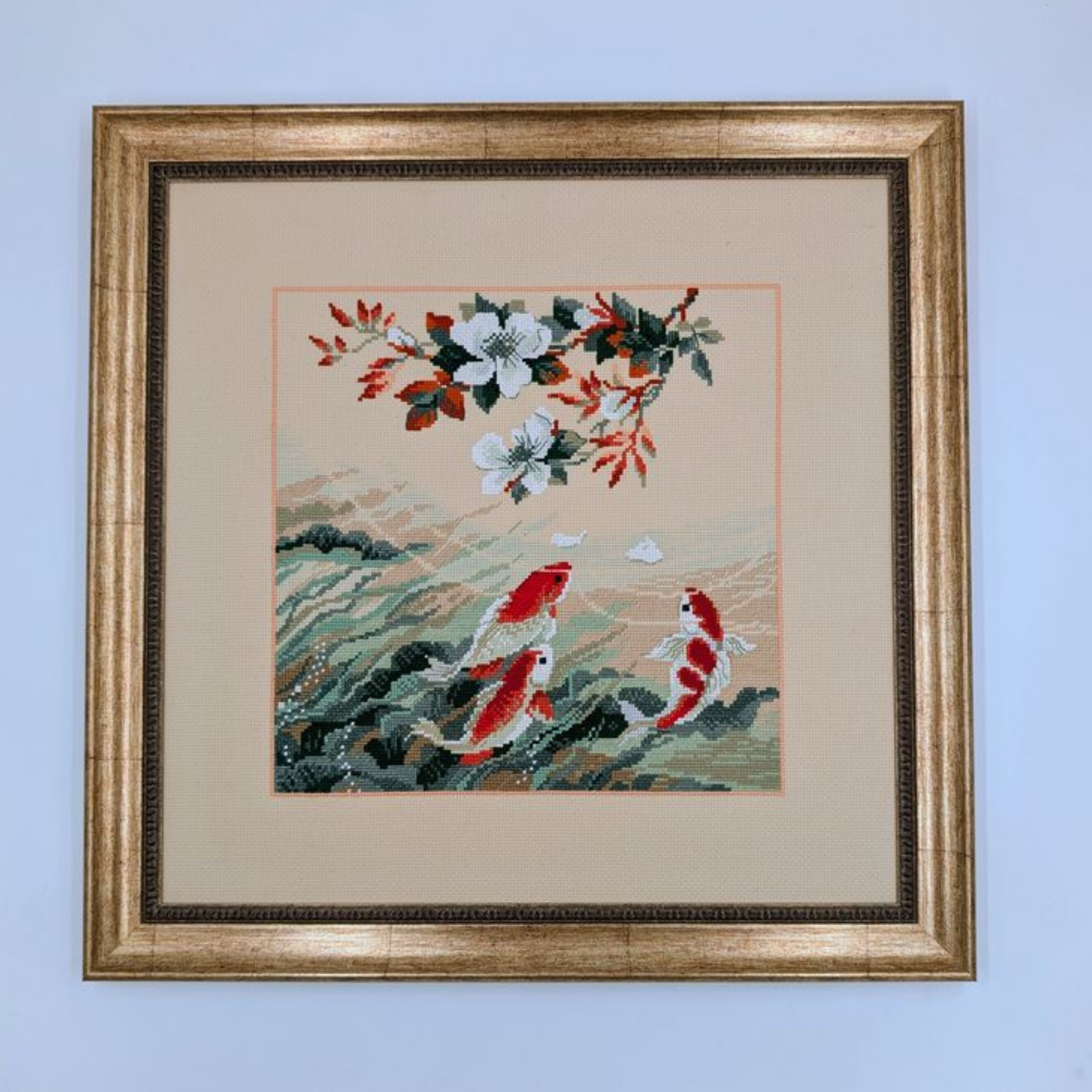 This RIOLIS cross stitch artwork 1574 features three vibrant koi fish gliding through stylized waves, framed by delicate blossoms above. The flowing composition and balanced color palette create a feeling of calm energy, blending water, nature, and motion into a timeless decorative scene. Perfect for admirers of Eastern-inspired art and symbolic designs, this piece adds elegance and serenity to any space.