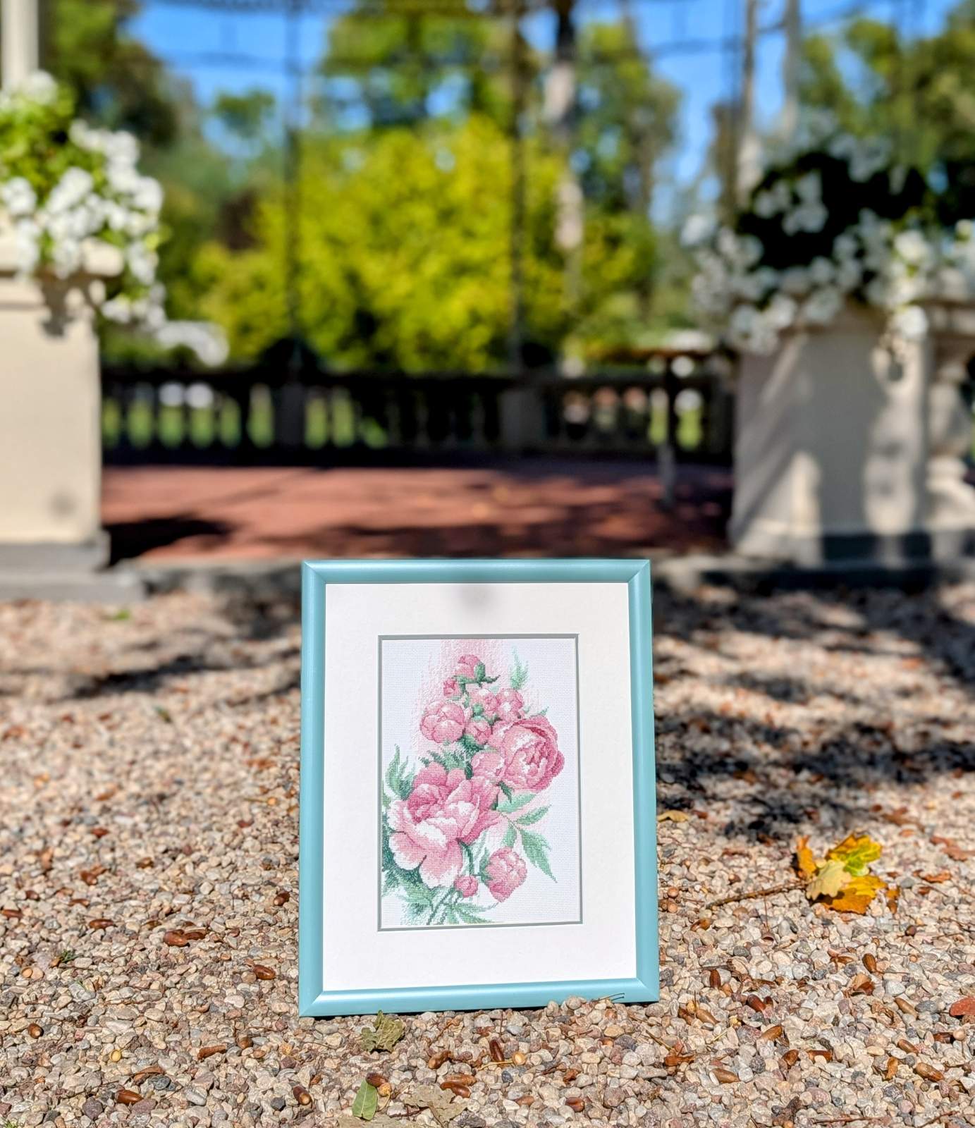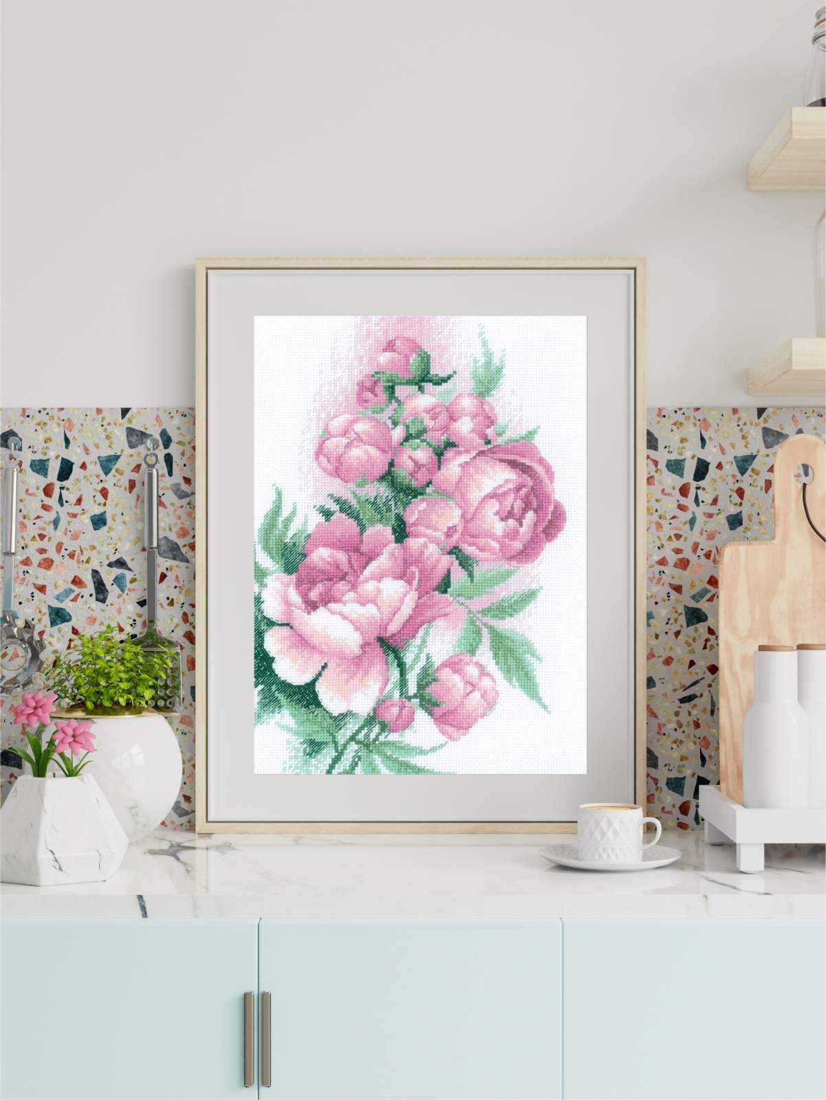 This RIOLIS cross stitch kit features cascading pink peonies surrounded by delicate buds and leaves. The design captures soft floral beauty. Perfect for flower lovers, this kit brings timeless elegance to your embroidery collection.