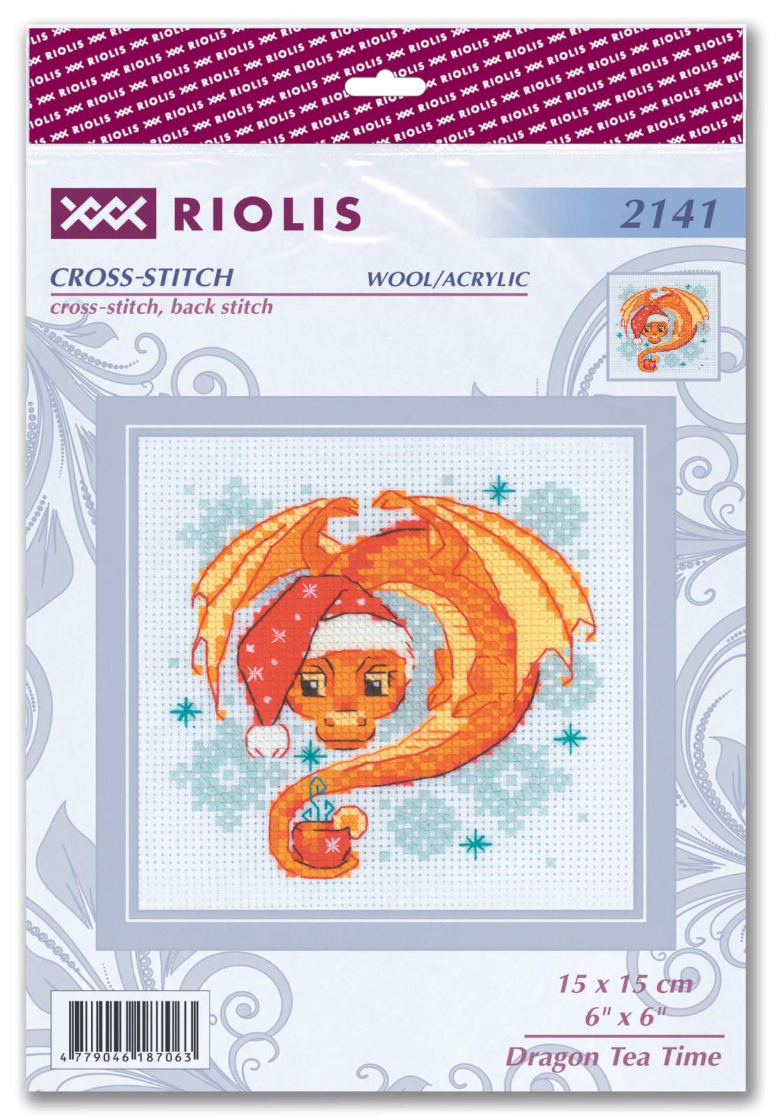 Add whimsical holiday magic to your stitching with the 2141 Dragon Tea Time Cross-Stitch Kit from RIOLIS. This playful design shows a bright orange dragon enjoying a quiet winter moment. Wearing a red Santa hat and holding a steaming cup of tea, the dragon feels both charming and cozy. Soft blue snowflakes float around, adding a magical winter atmosphere to the scene.