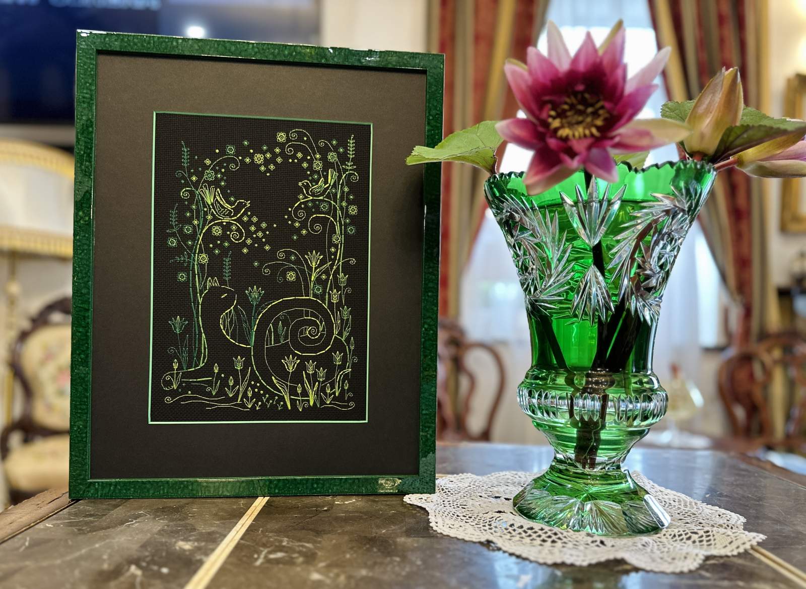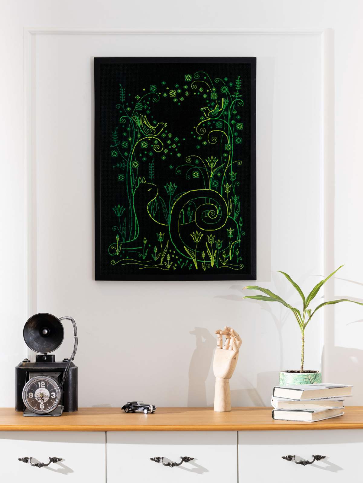 Once complete, this embroidery becomes a striking wall decoration that celebrates the peaceful magic of spring evenings. It’s also a thoughtful handmade gift for anyone who loves cats, songbirds, or glowing floral designs.
