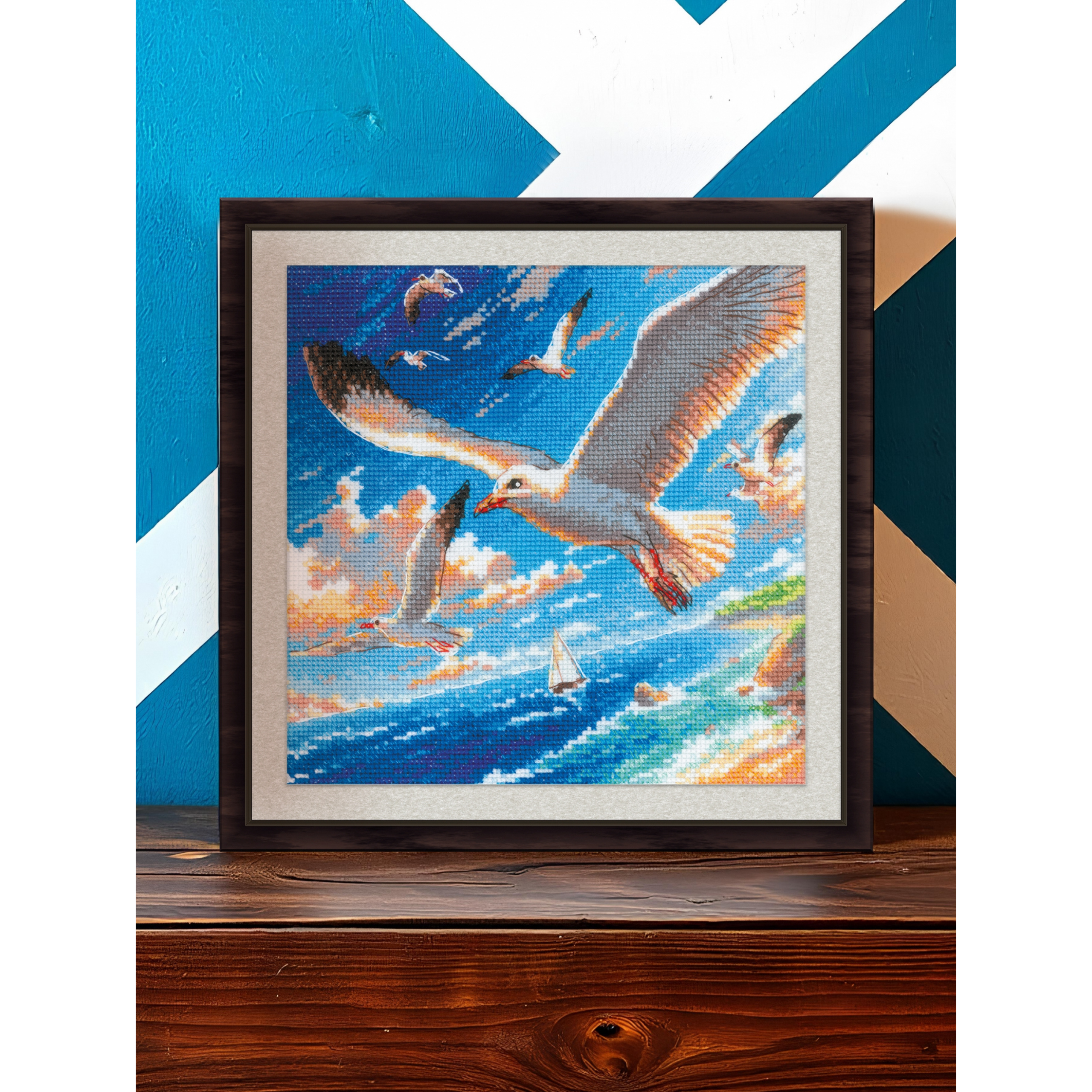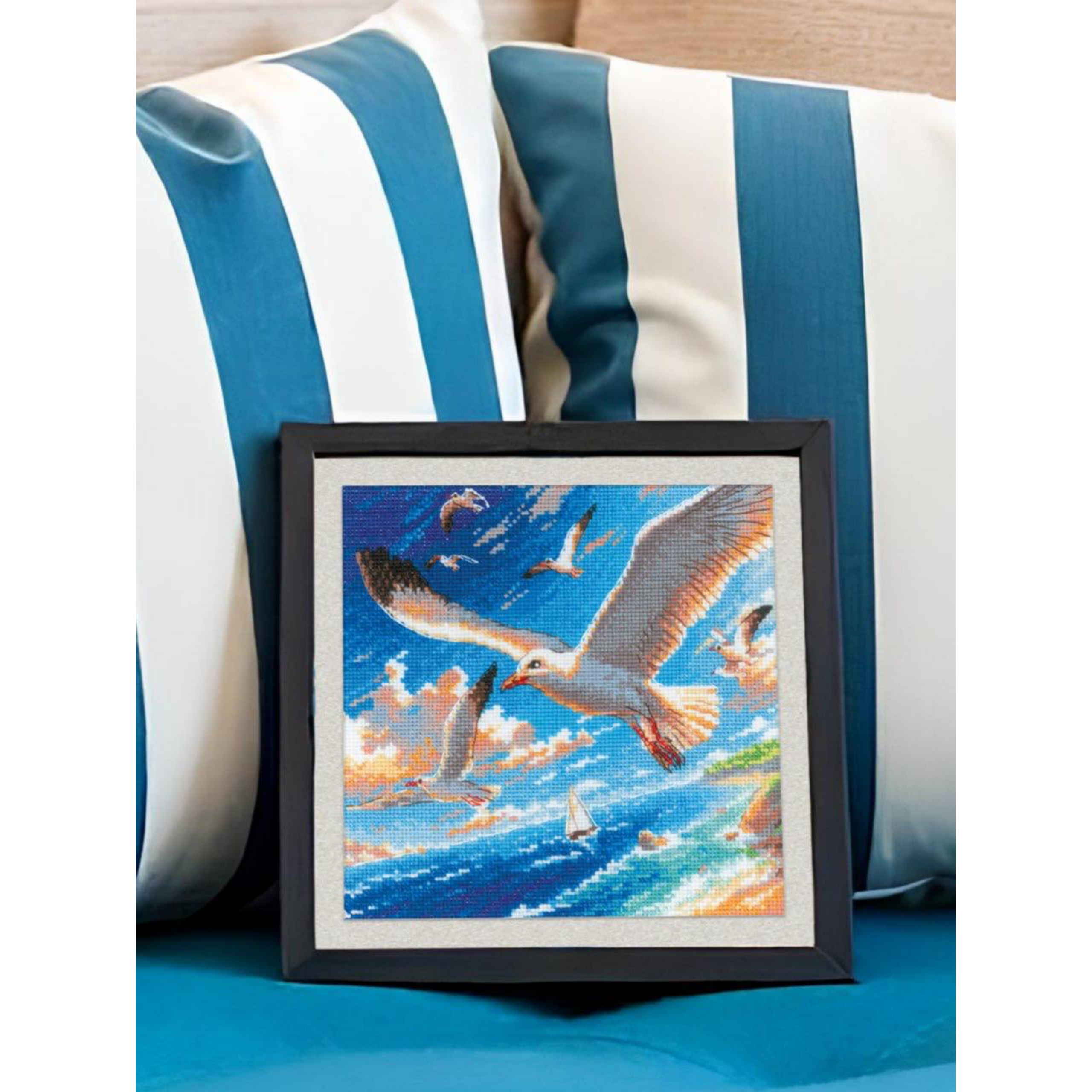 This RIOLIS cross stitch kit 2232 features soaring seagulls above a bright blue sea with a sailboat and rocky coastline. The design captures ocean freedom. Perfect for seaside lovers, this kit brings breezy coastal charm to your embroidery collection.
