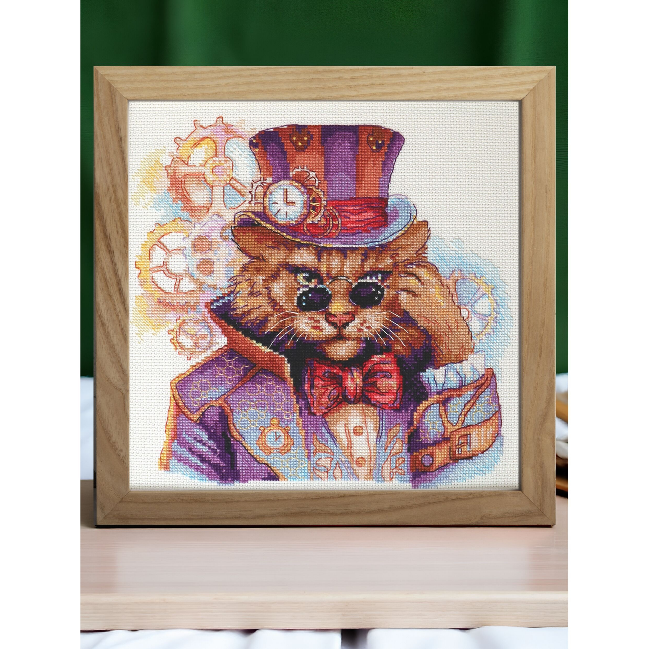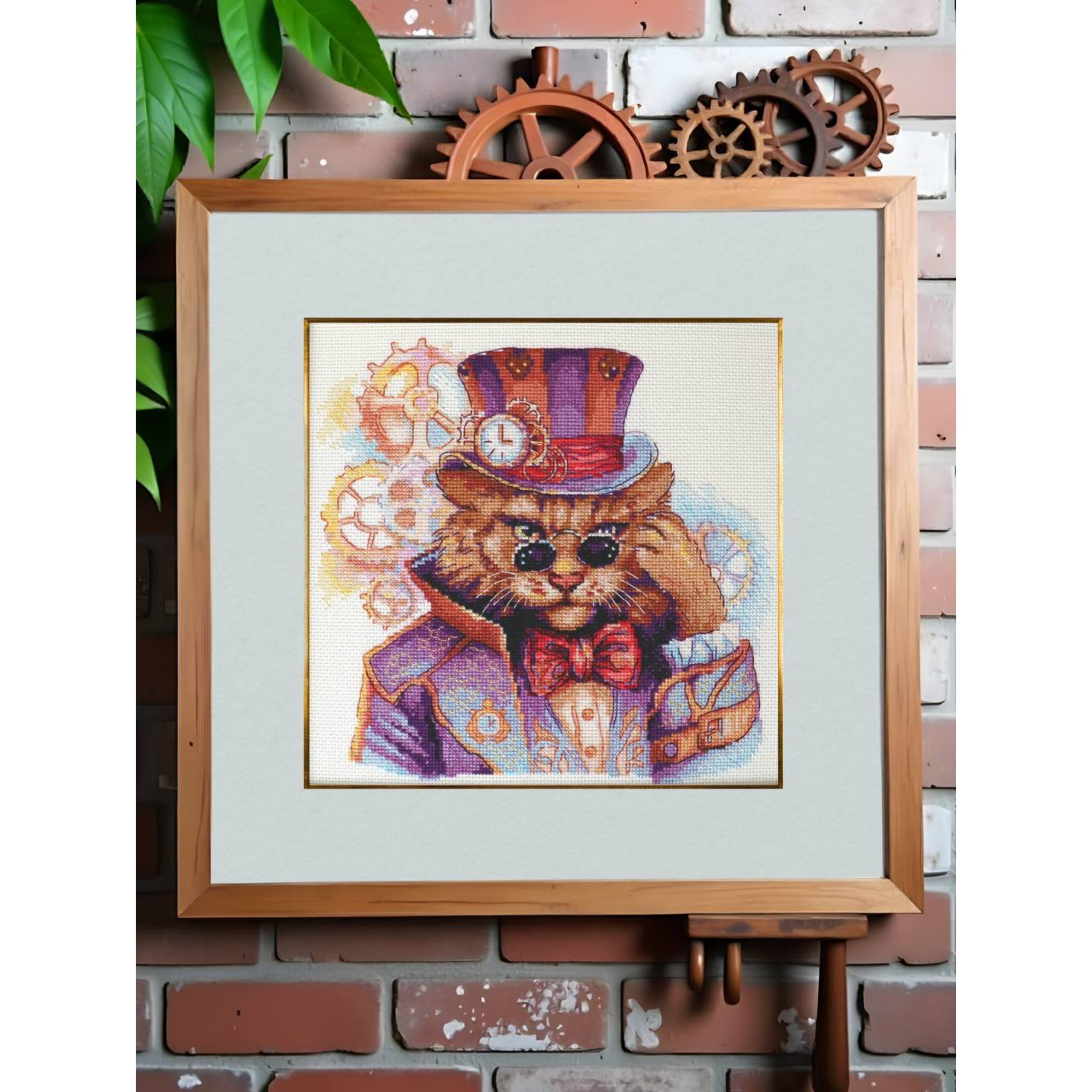 Step into a world of gears and whimsy with the 2278 Steampunk Cat Cross-Stitch Kit from RIOLIS. This fun design features a dapper cat in full steampunk attire. The cat wears a tall, striped top hat decorated with gears and a small clock. Round goggles add a Victorian mechanical flair. A bright red bow tie and a richly patterned jacket complete the outfit. Behind the cat, glowing cogs and wheels create a bold industrial fantasy scene.