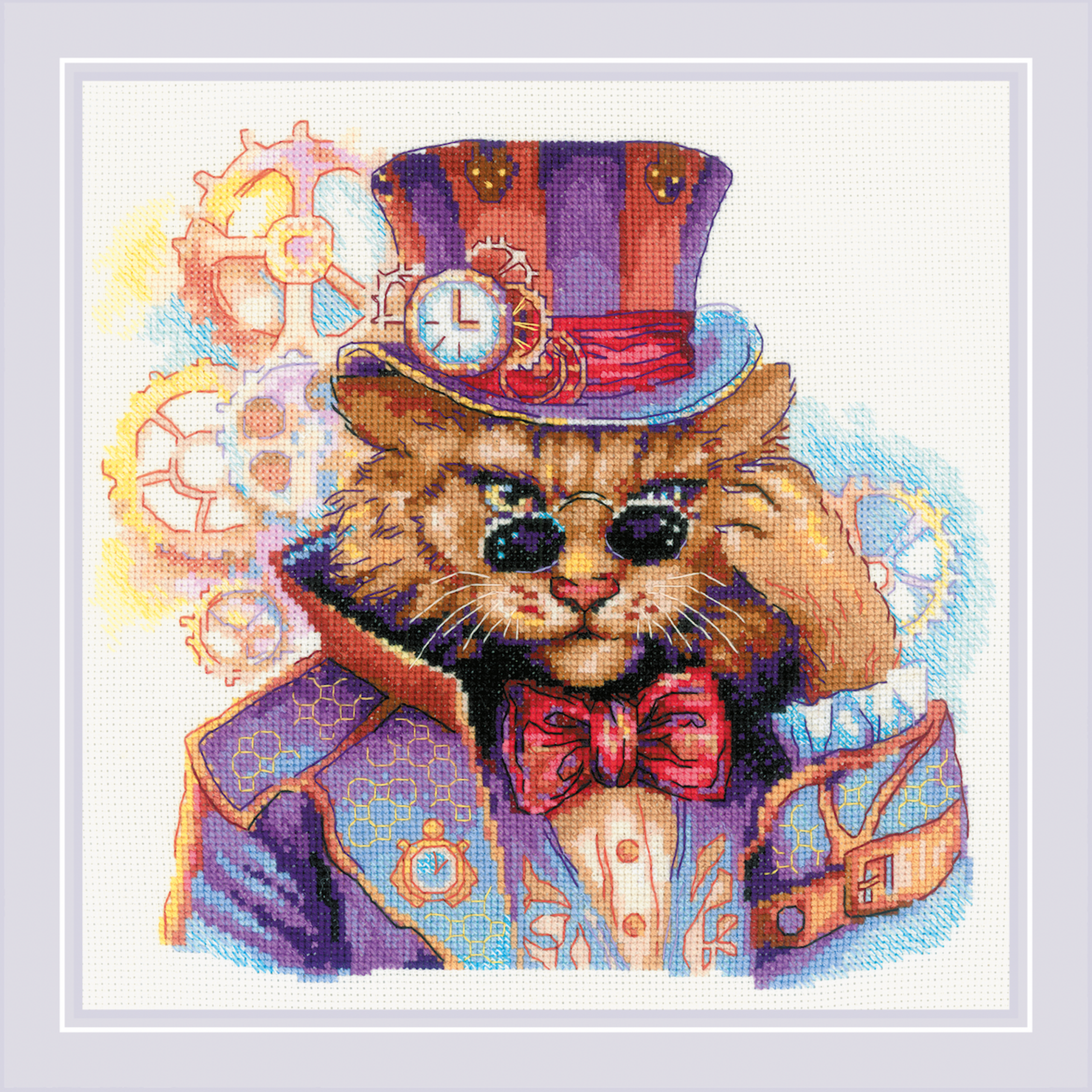 This RIOLIS cross stitch kit 2278 features a cat dressed in steampunk fashion with gears, goggles, and a top hat. The design captures whimsical, mechanical charm. Perfect for cat lovers and steampunk fans, this kit brings a playful, imaginative vibe to your embroidery collection.