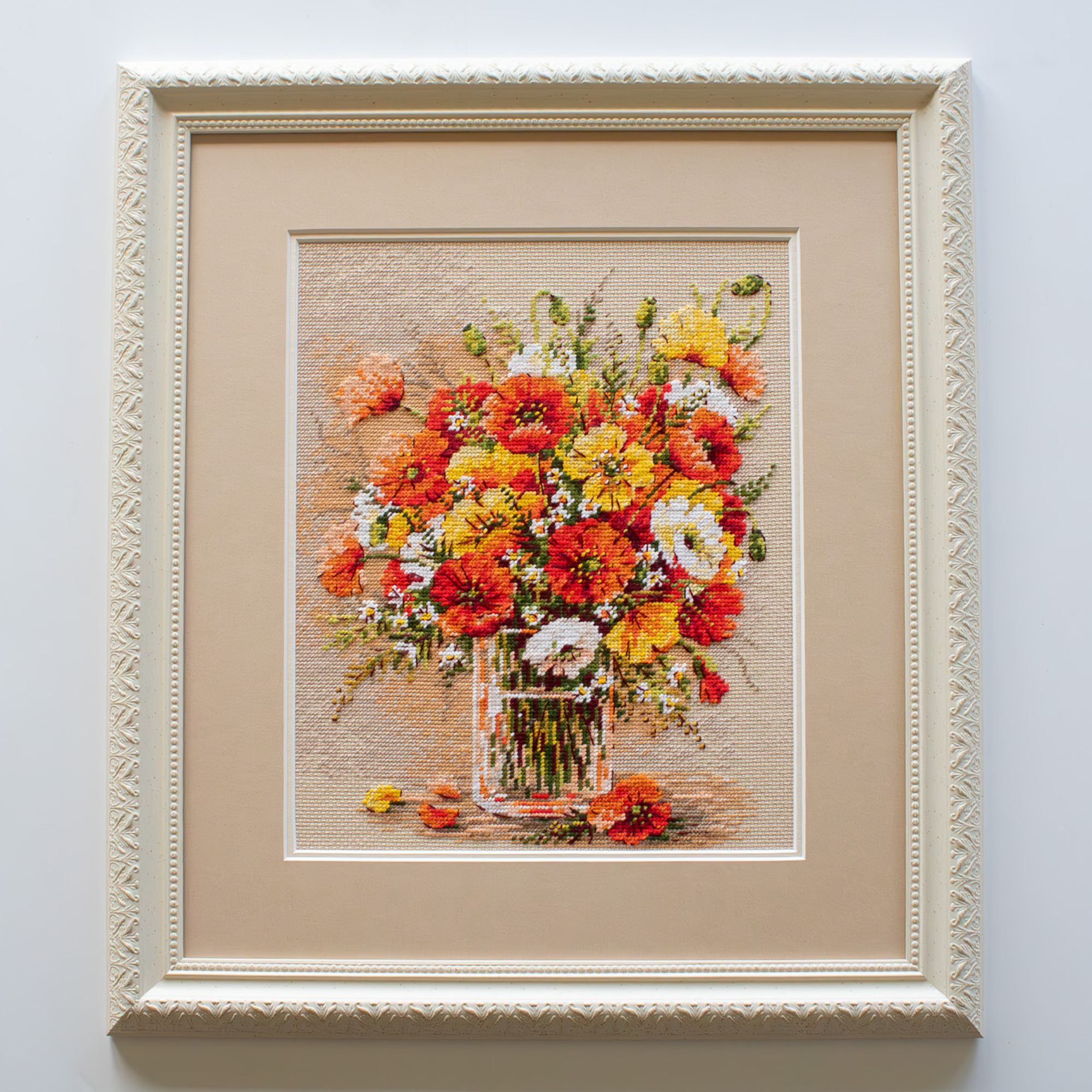 Bring summer’s joyful colors into your home with the 2306 Field Poppies Cross-Stitch Kit from RIOLIS. This radiant design features a vibrant bouquet of red, yellow, and white poppies gathered in a clear glass vase. Scattered petals rest below, adding a natural and effortless charm.