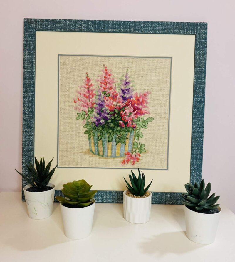 This RIOLIS cross stitch kit 2059 features astilbe flowers in pink, purple, and red shades arranged in a striped pot with lush greenery. The design captures soft floral elegance. Perfect for garden lovers, this kit brings blooming charm to your embroidery collection.