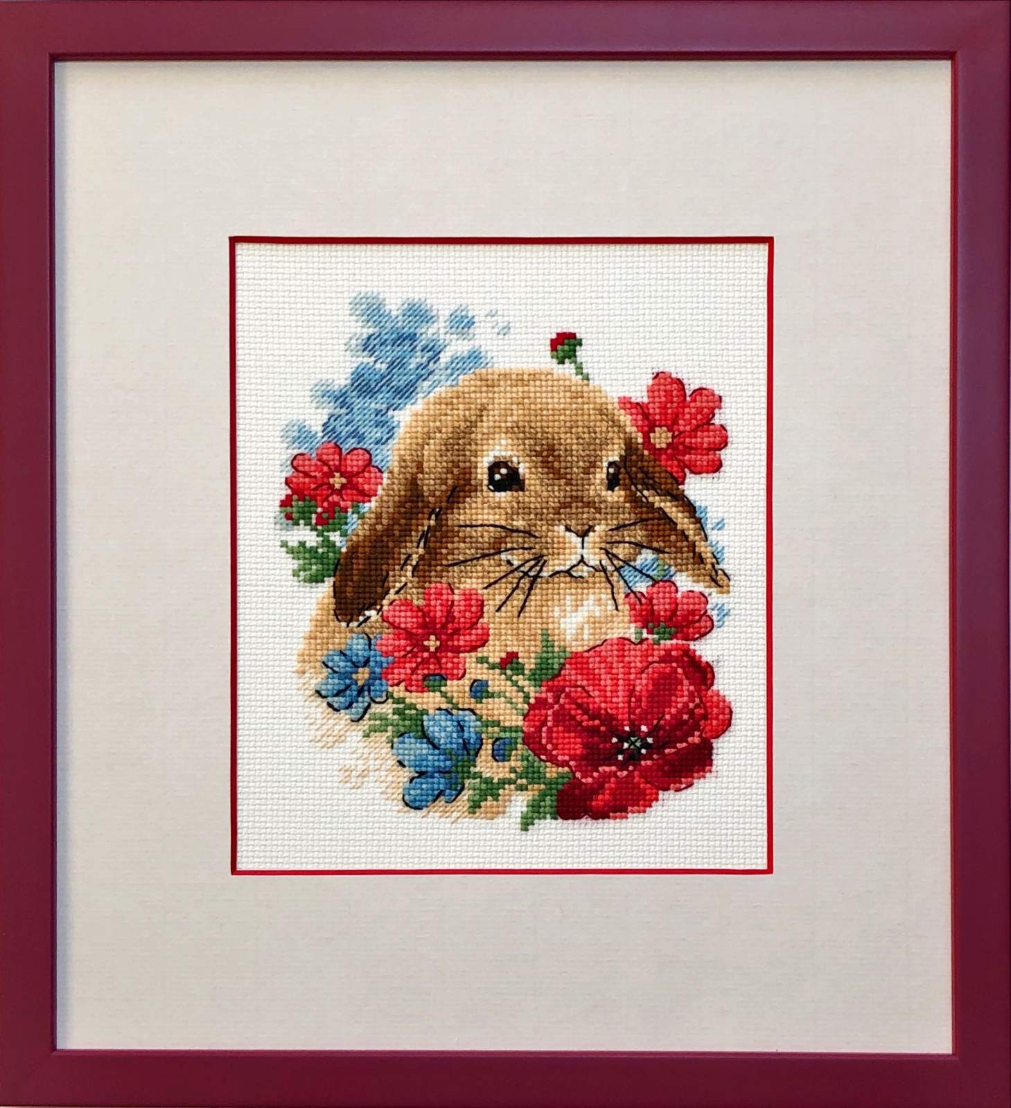 Welcome a little cuteness into your craft time with the 1986 Bunny in Flowers Cross-Stitch Kit from RIOLIS. This gentle design features a fluffy brown bunny nestled among a colorful bouquet of red poppies, pink blooms, and blue wildflowers. Its soft expression and big eyes bring a sense of innocence and calm to the scene.