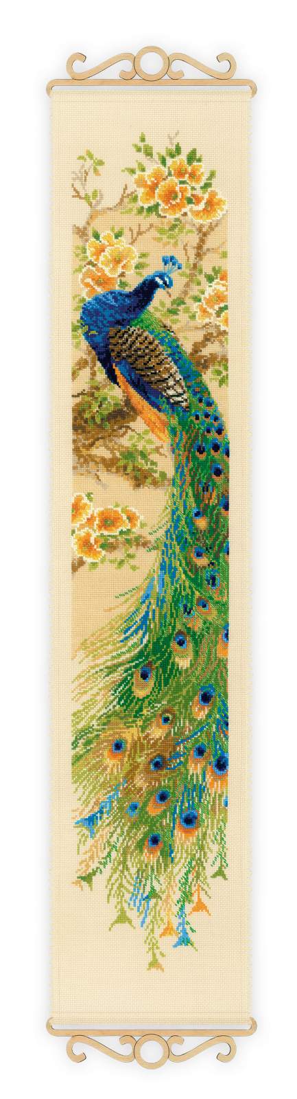1834 Eastern Beauty Cross-Stitch Kit from RIOLIS brings vibrant color and graceful elegance into your home. This eye-catching design features a majestic peacock perched on the branch of a flowering tree. Behind the bird, soft orange blossoms bloom in clusters, adding warmth and balance to the scene. The peacock’s long tail feathers cascade downward, flowing in layers of green, turquoise, gold, and deep blue. The shading in each feather adds depth and texture, creating a sense of motion and light.