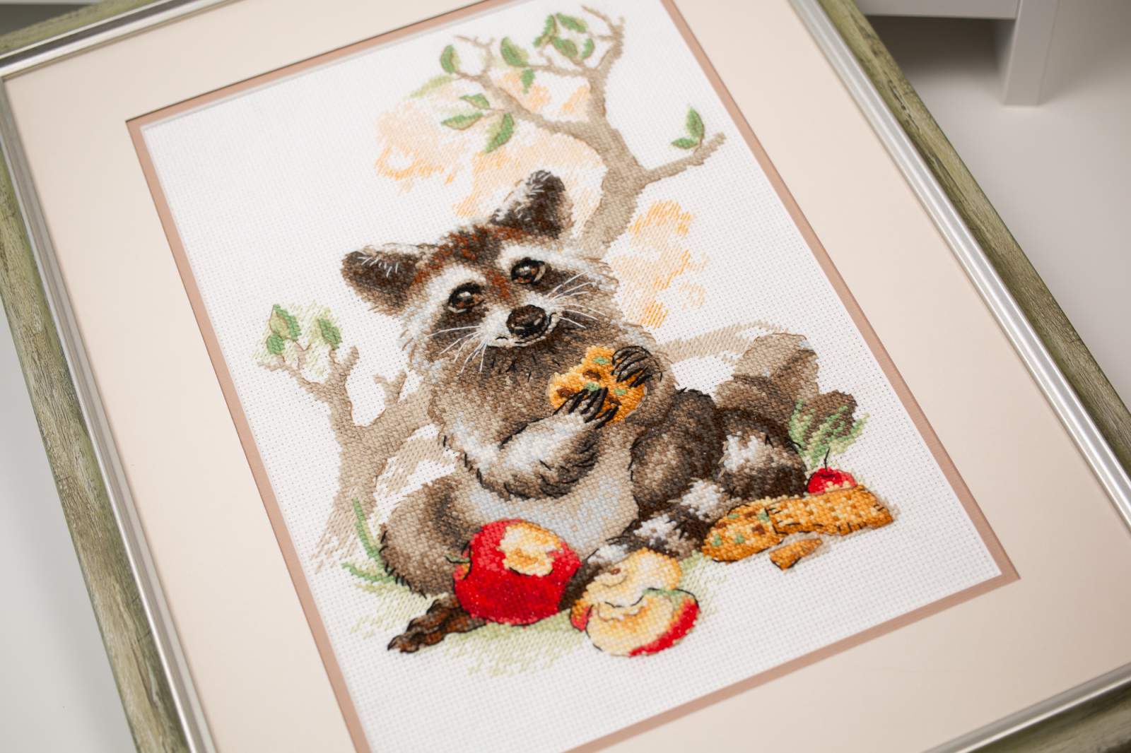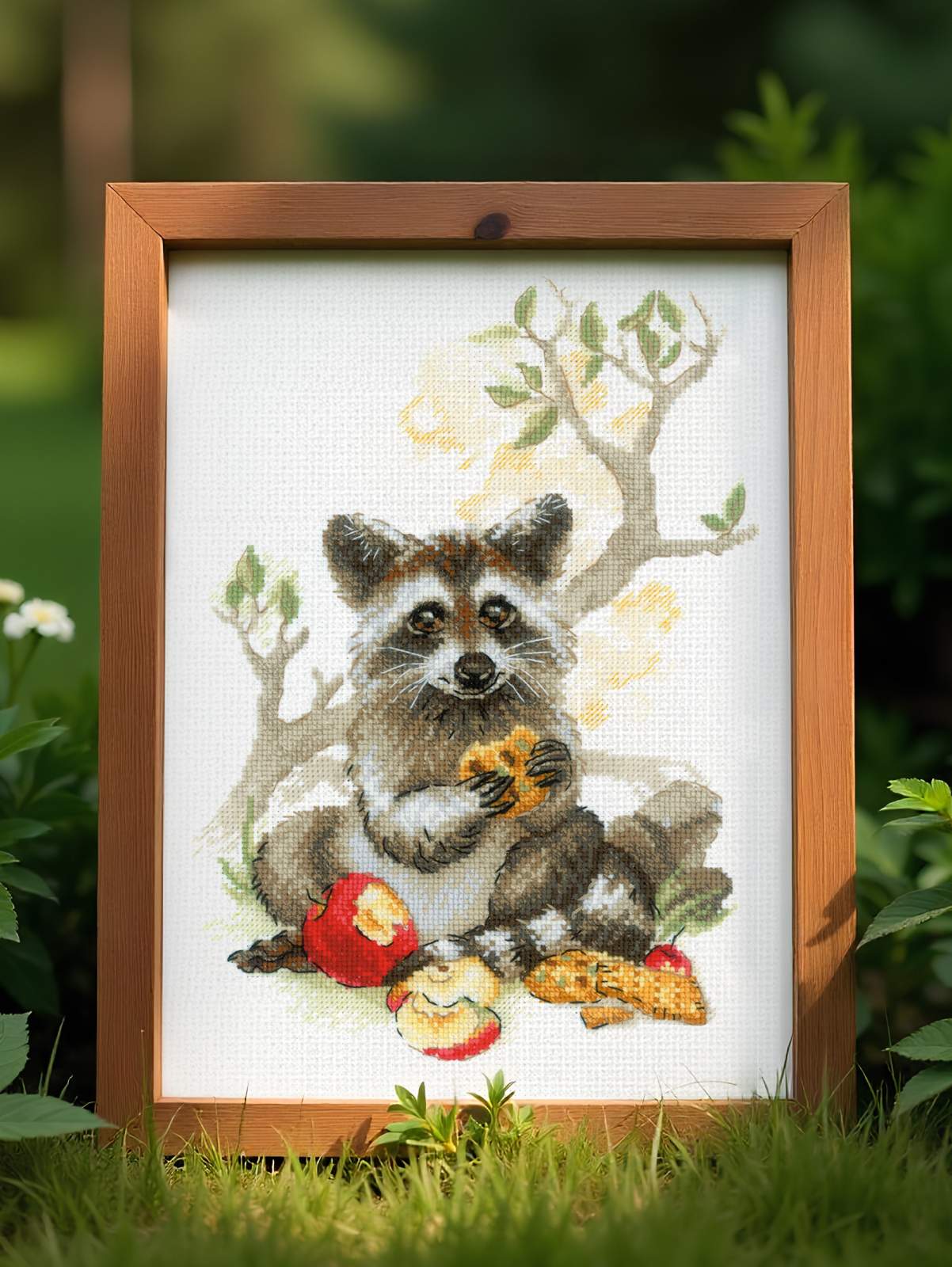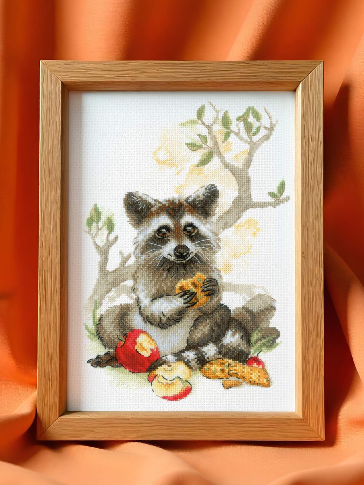 Bring a touch of woodland charm into your home with the 2033 Fluffy Sweet Tooth Cross-Stitch Kit from RIOLIS. This cheerful design shows a fluffy raccoon happily holding a cookie in its tiny paws. The scene includes bitten apples, scattered biscuits, and a light background with soft trees and leaves. The raccoon’s wide eyes and sweet expression create an irresistible look. Altogether, the image feels cozy, playful, and full of personality.