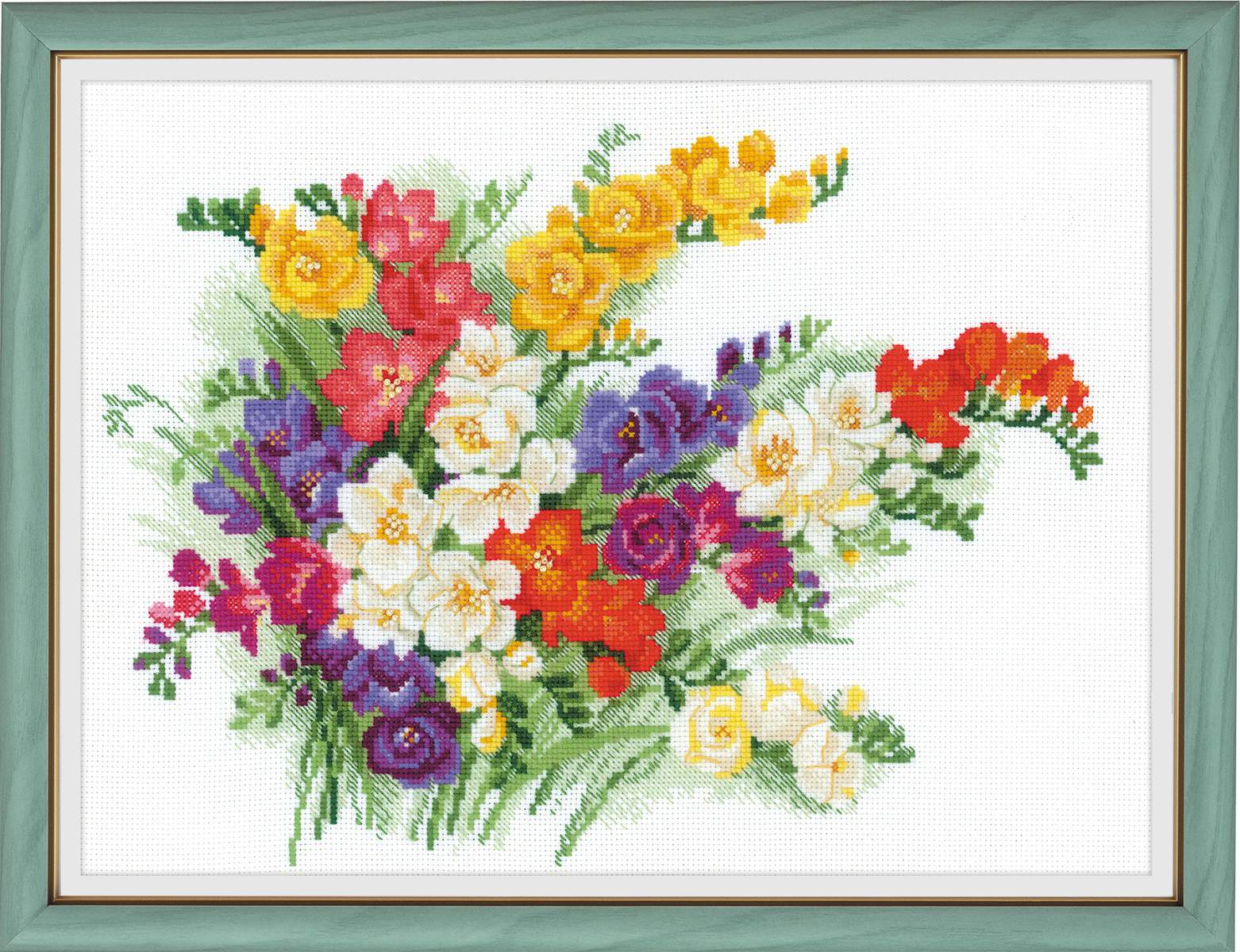 Bring a burst of floral joy into your home with the 1561 Freesia Cross-Stitch Kit from RIOLIS. This vibrant design features a colorful bouquet of freesias in rich shades of yellow, red, purple, and white. In addition, soft green leaves complete the arrangement, adding a fresh and lively feel to the design. Altogether, the scene beautifully captures the cheerful spirit of spring and summer flowers.