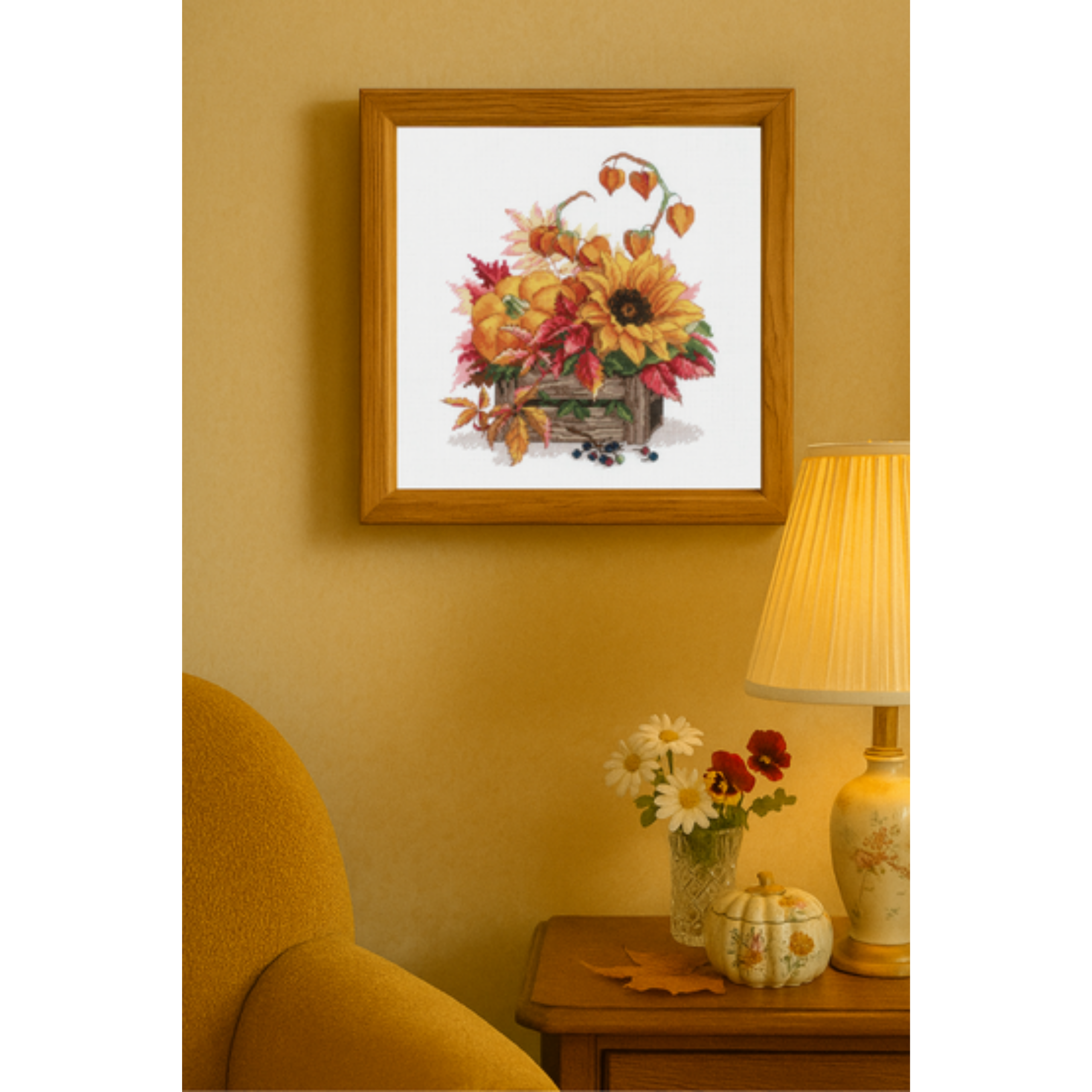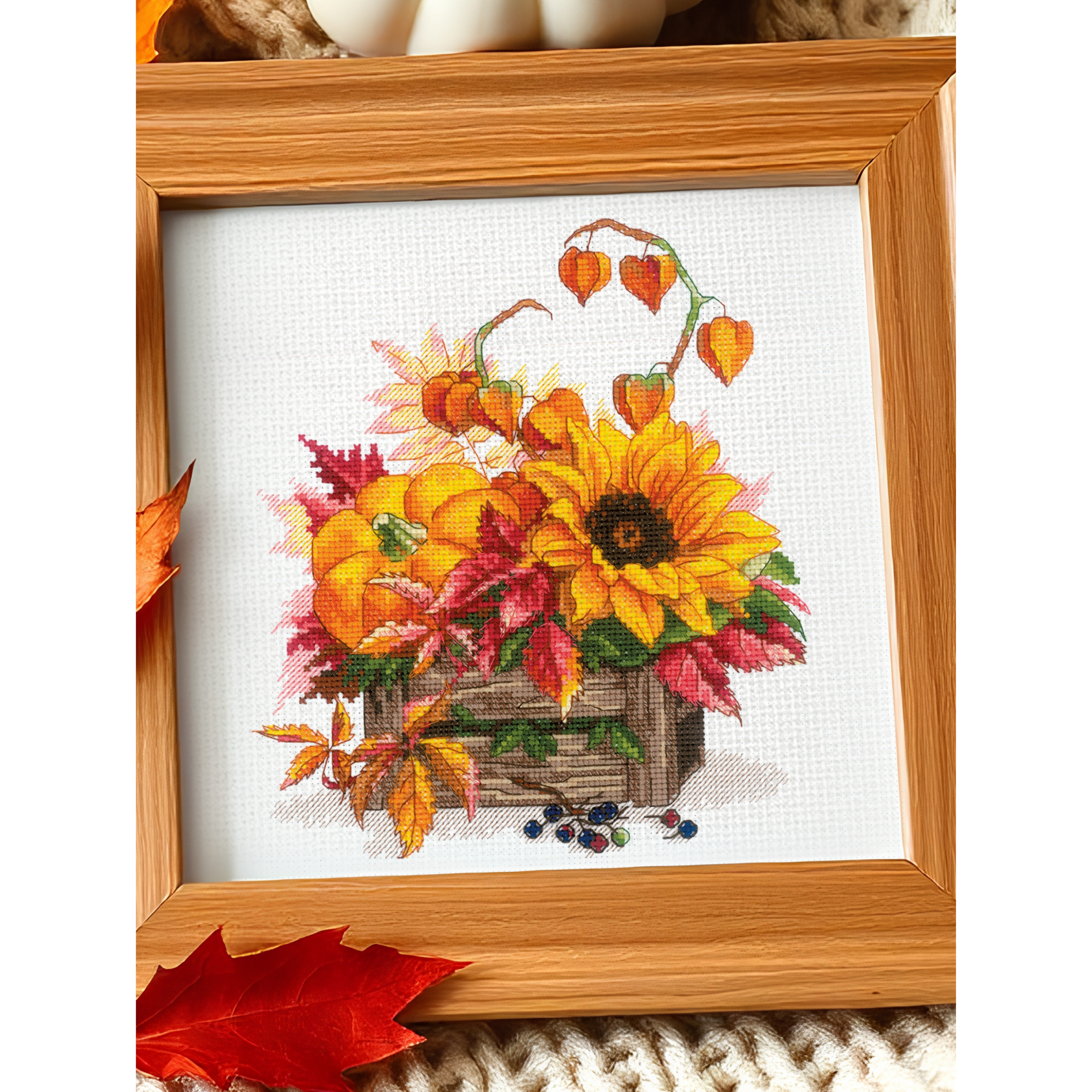 Celebrate the golden season with the Hello Autumn Cross-Stitch Kit from RIOLIS. This colorful design shows a wooden crate filled with pumpkins, bright sunflowers, and autumn leaves in red and orange. Twisting stems of Chinese lantern flowers and scattered berries add extra charm and detail.