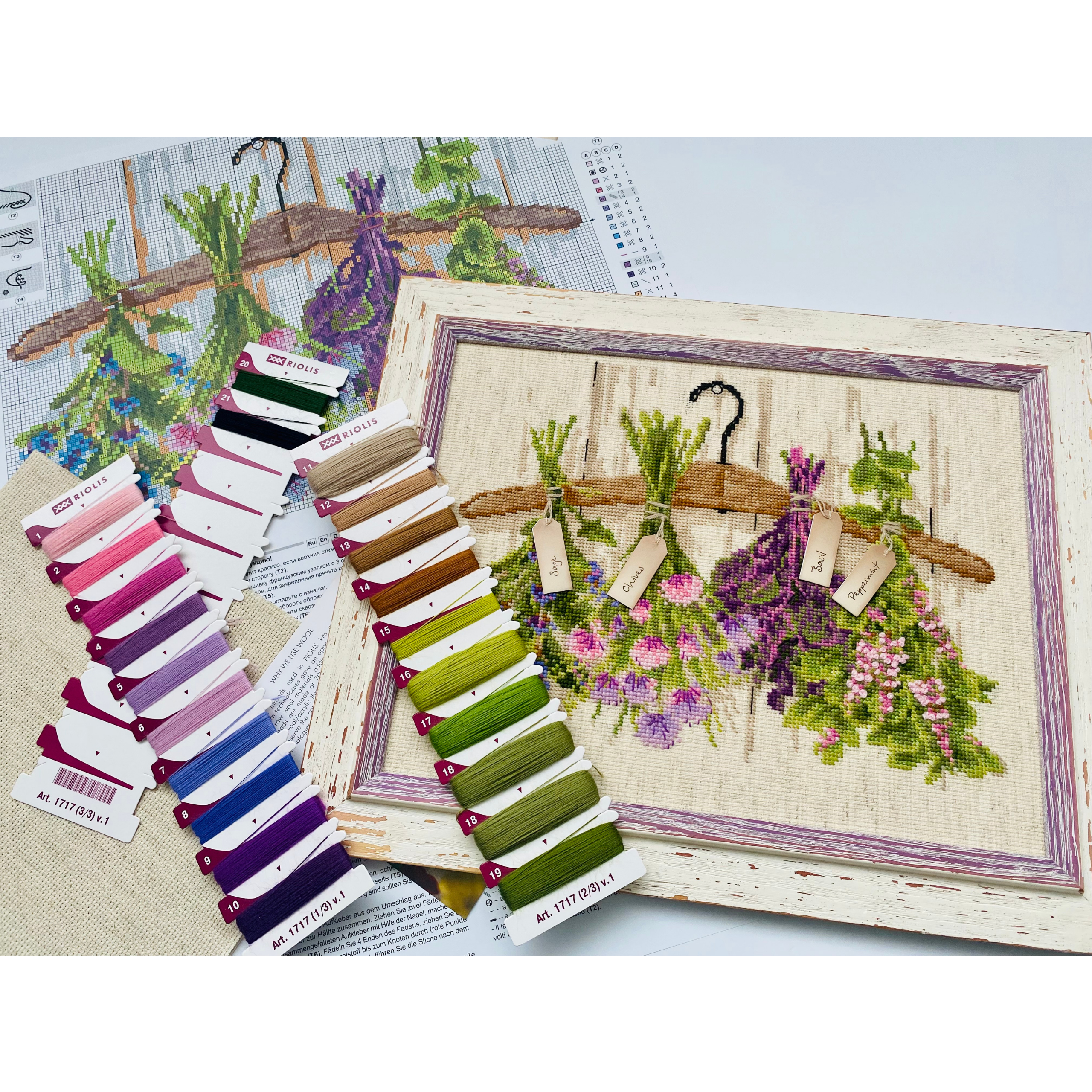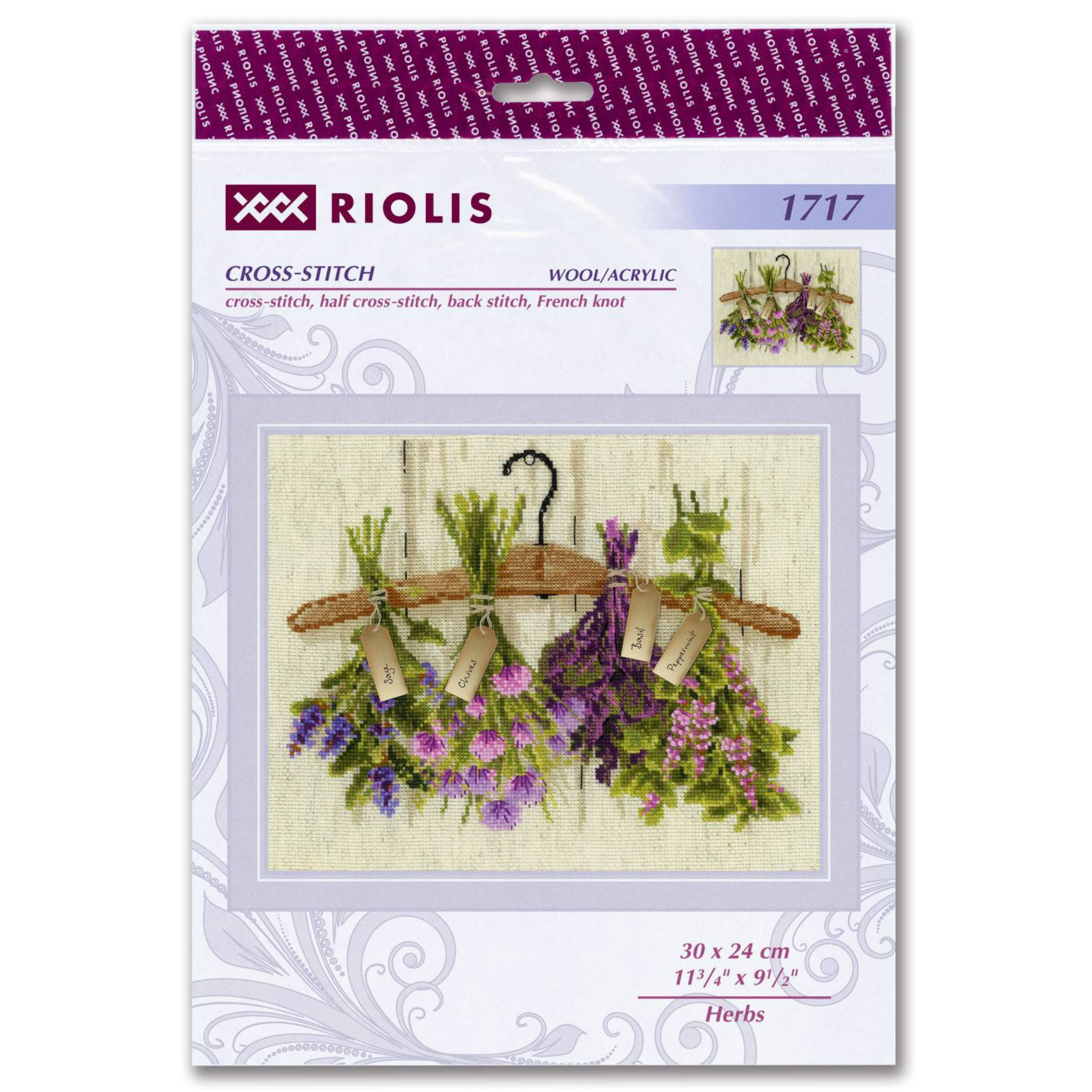 Bring the scent and simplicity of the garden into your home with the 1717 Herbs Cross-Stitch Kit from RIOLIS. This charming design features four bundles of fresh herbs—sage, chives, basil, and peppermint—tied to a wooden hanger with handwritten tags. The soft colors and delicate shading give the herbs a fresh-picked look, while the neutral background keeps the focus on their natural beauty.