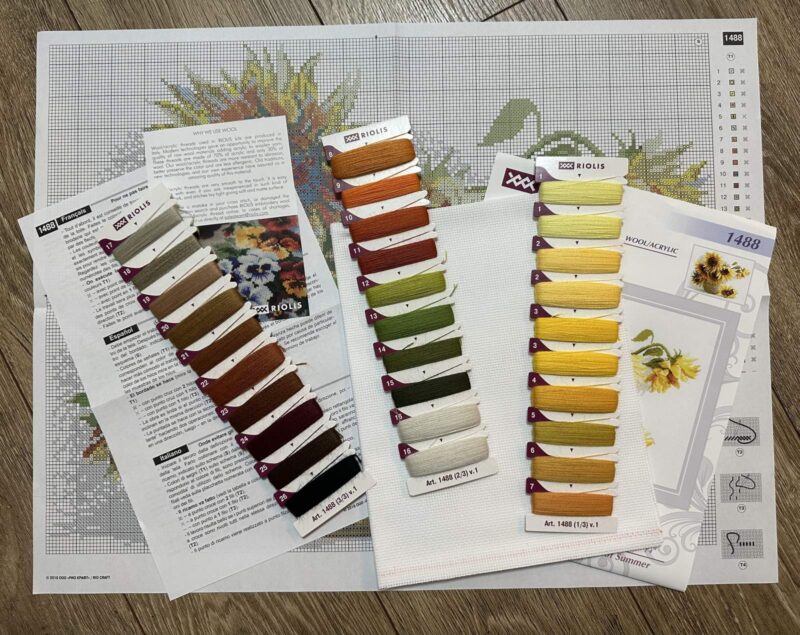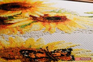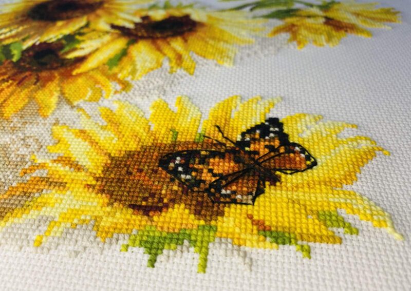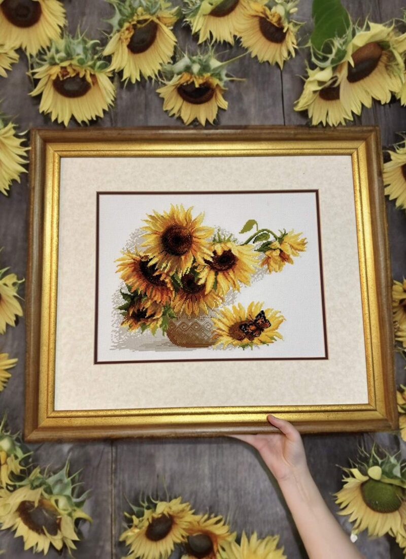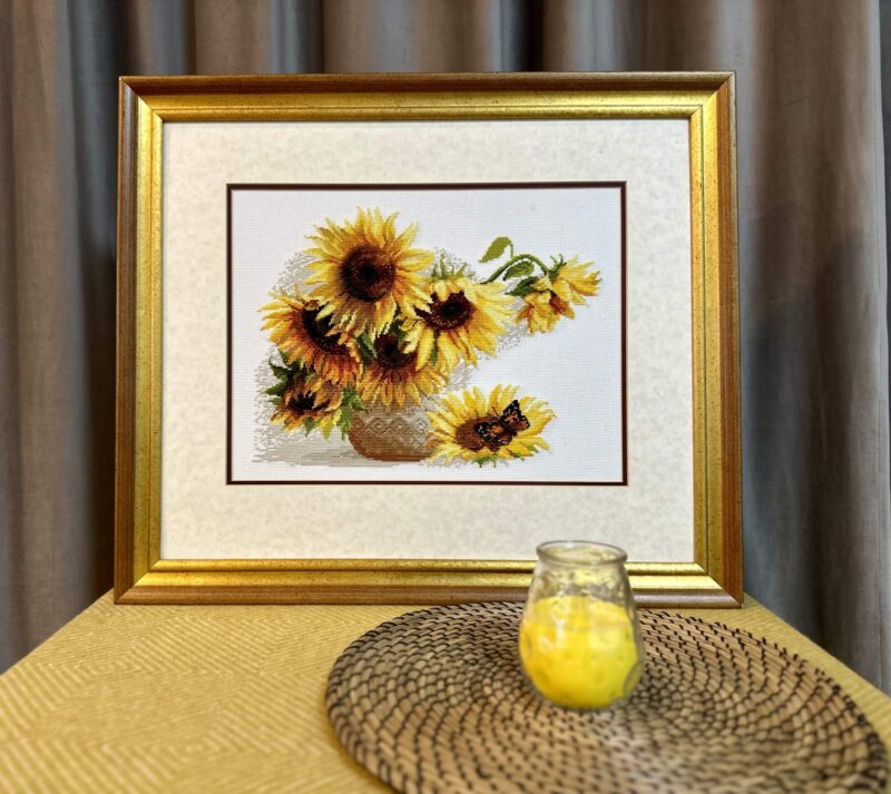 Bring a touch of summer warmth into your home with the 1488 Hot Summer Cross-Stitch Kit from RIOLIS. This bright floral design features golden sunflowers arranged in a rustic vase. Their rich yellow petals glow with the warmth of sunny days. A delicate butterfly rests gently on a fallen bloom. Together, the flowers and butterfly create a peaceful, cheerful scene. This design captures the simple beauty of long summer afternoons in the countryside.