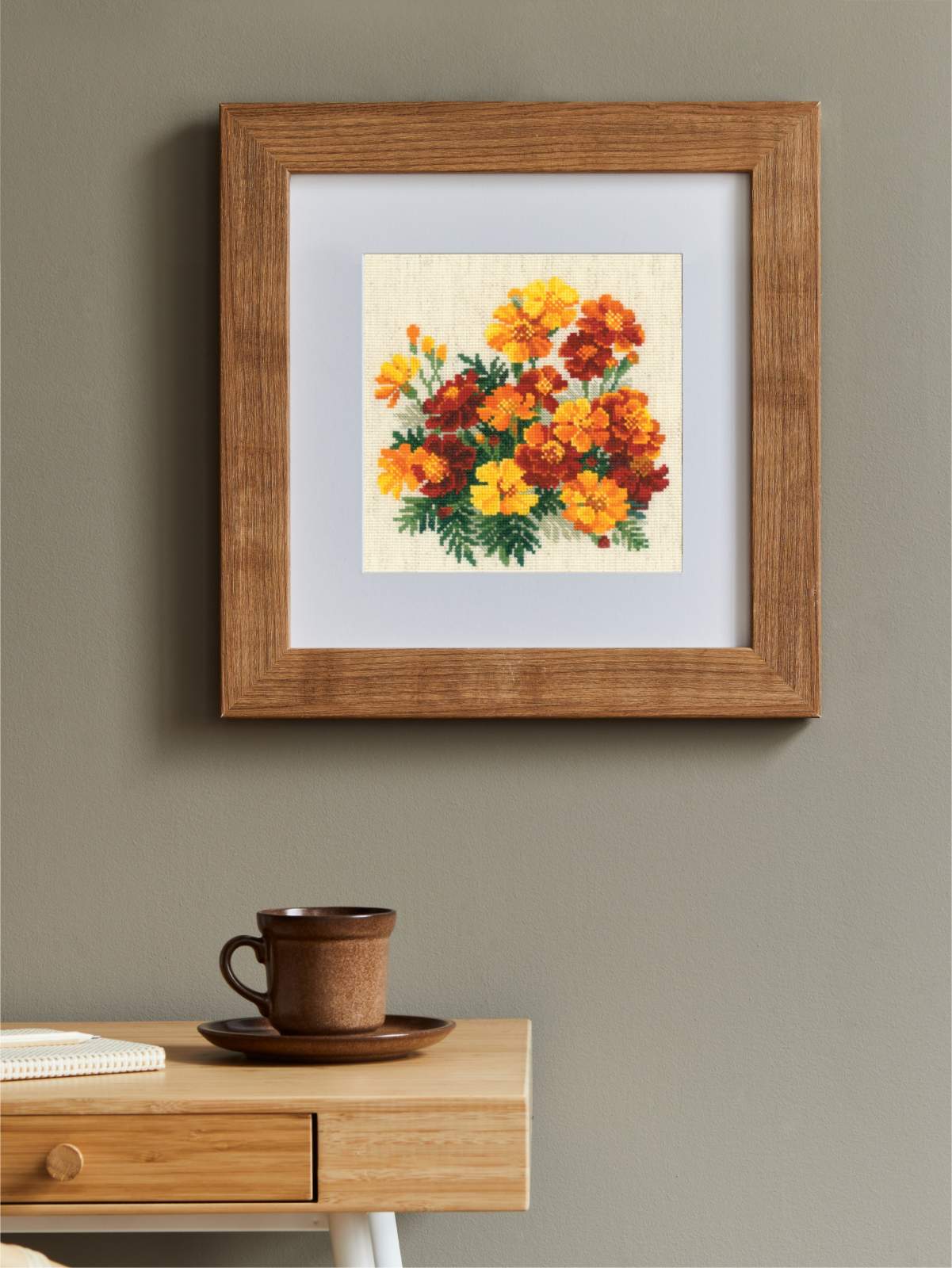 Whether you’re a beginner or an experienced stitcher, this kit is an excellent choice. Not only is the project simple, but it is also satisfying, offering a relaxing way to spend your free time. As you stitch, each marigold slowly comes to life. Gradually, the vibrant display of color appears on your canvas. Once finished, the piece will add rustic floral charm to your home. Alternatively, it can be given as a thoughtful handmade gift. In the end, this kit truly celebrates the timeless beauty of flowers and provides a calm, creative escape for anyone who enjoys stitching.