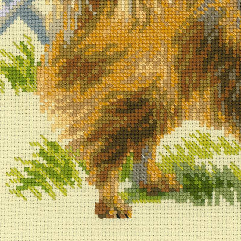 Bring a touch of playful charm into your home with the 1585 Pomeranian Cross-Stitch Kit from RIOLIS. This cute design shows a fluffy Pomeranian standing proudly on soft grass. Its golden fur and bright eyes give it a lively, cheerful look. In the background, a green tree and garden fence complete the scene. Altogether, it captures the warmth of a sunny day outdoors.