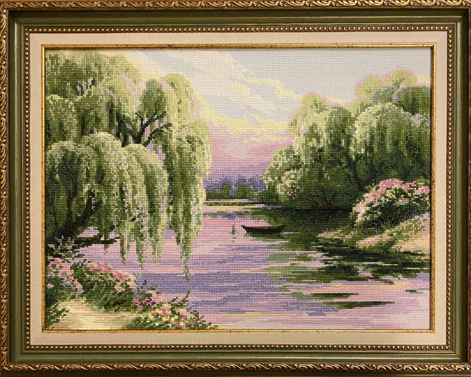 Find peace in every stitch with the 2012 Quiet Morning Cross-Stitch Kit from RIOLIS. This calming design shows a quiet riverside wrapped in soft morning light. Weeping willows lean gently over the water, their branches reflected in purple and green ripples. A small boat floats on the still river, adding a quiet human touch to the natural scene.