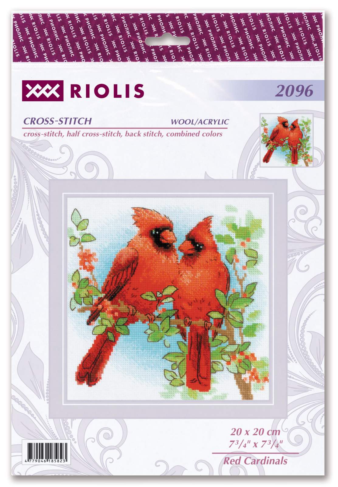 This RIOLIS cross stitch kit 2096 features two vivid red cardinals resting on a leafy branch under a blue sky. The design captures natural beauty and harmony. Perfect for bird lovers, this kit brings a lively touch of nature to your embroidery collection.