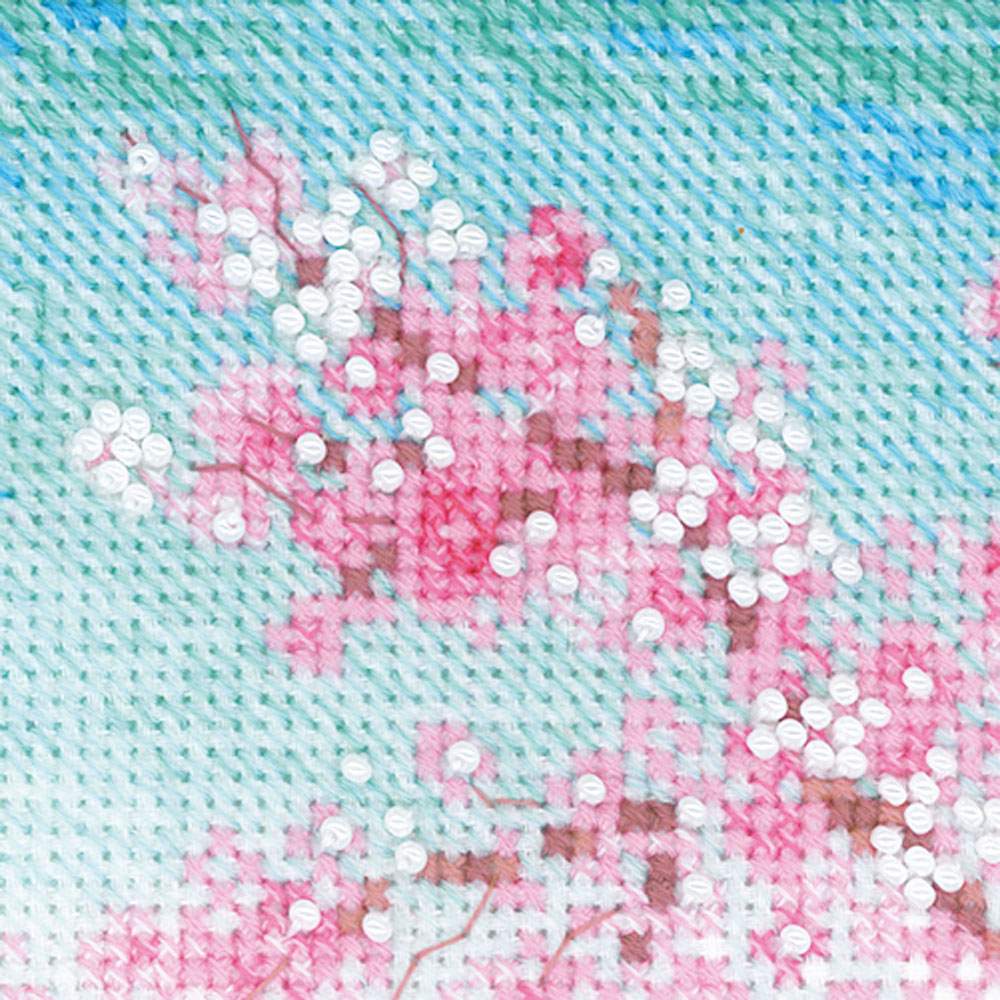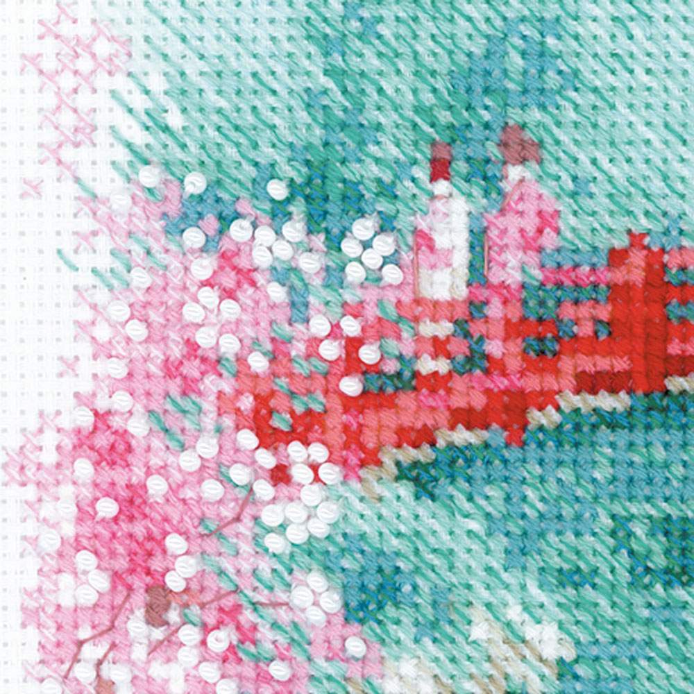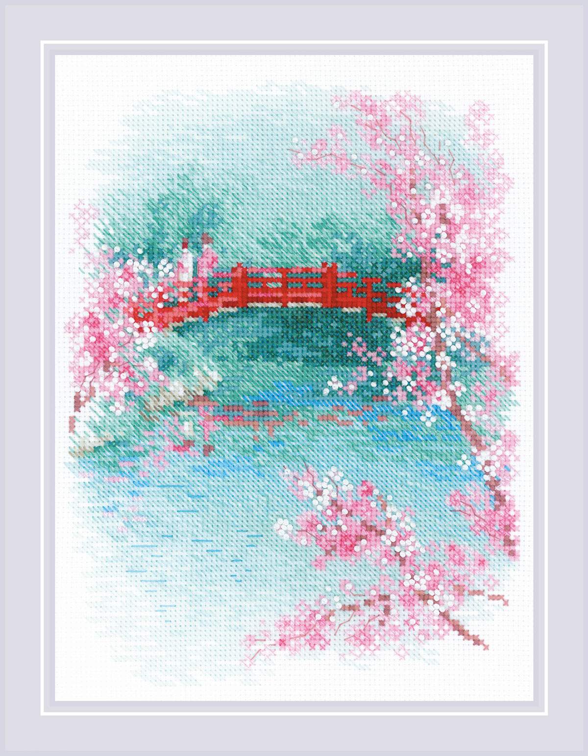 Capture the grace of spring in bloom with the 1745 Sakura. Bridge Cross-Stitch Kit from RIOLIS. This peaceful scene shows a red bridge arching gently over a still pond, framed by delicate cherry blossom trees. Soft greens and blues blend into the background, while touches of pink and white suggest drifting petals and new life.
