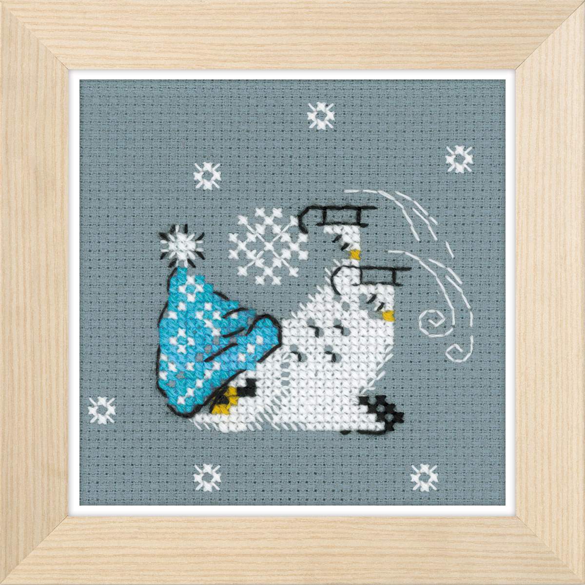 Bring winter whimsy into your home with the 1665 Skates Cross-Stitch Kit from RIOLIS. This fun design features a playful owl in a blue polka-dot hat and tiny ice skates. It slips and slides across a snowy scene. Snowflakes fall gently around it. The soft gray background adds a cozy, modern feel to this charming winter moment.