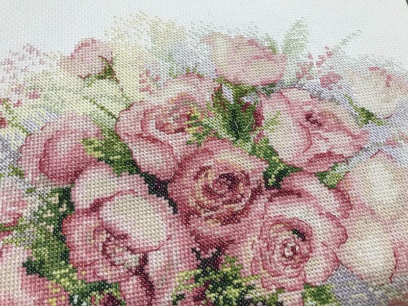 Bring a touch of soft floral beauty into your home with the 1335 Watercolor Roses Cross-Stitch Kit from RIOLIS. This delicate design features a fresh bouquet of pale pink roses, paired with gentle greenery and soft wildflowers. The subtle shading and light colors create a watercolor effect. As a result, the stitched bouquet appears airy, elegant, and full of charm. Altogether, the design captures the softness of real roses and adds a quiet touch of nature to any space.