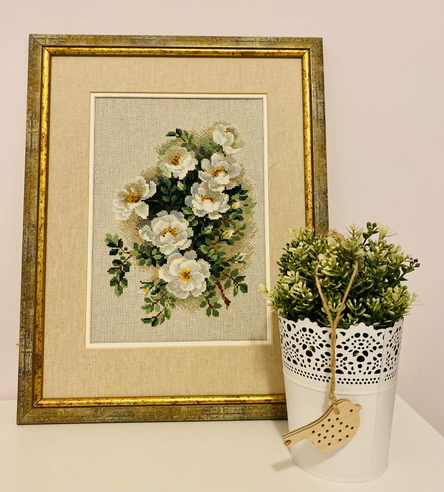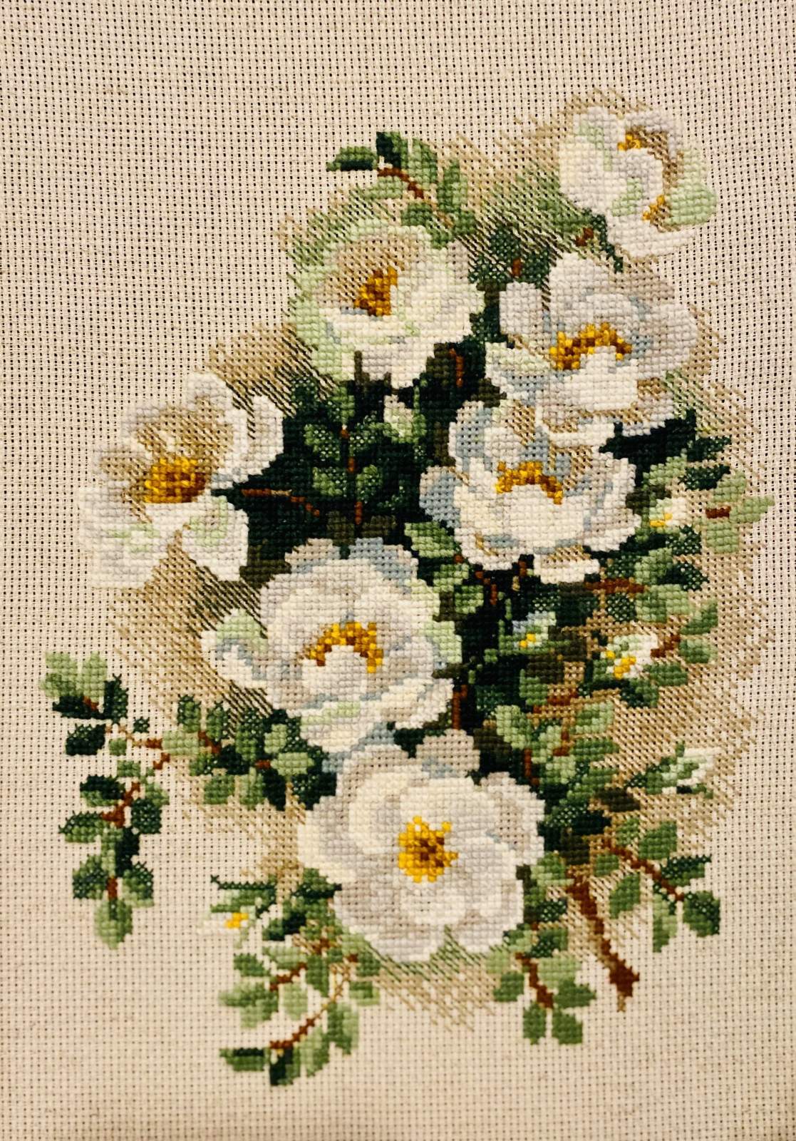 Bring floral elegance into your home with the White Briar Cross-Stitch Kit from RIOLIS. This fresh and delicate design features a graceful bouquet of white briar roses, accented with soft green leaves and golden centers. The gentle colors and natural details create a peaceful still life that celebrates the simple beauty of garden flowers.