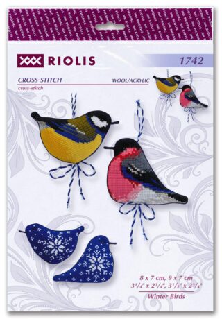 This RIOLIS cross stitch kit 1742 features three winter-themed bird ornaments: a yellow great tit, a red-breasted bullfinch, and a bluebird with snowflakes. The design captures seasonal charm with bright colors and cozy shapes. Perfect for holiday crafting and decorating, this kit brings handmade warmth to your winter collection.