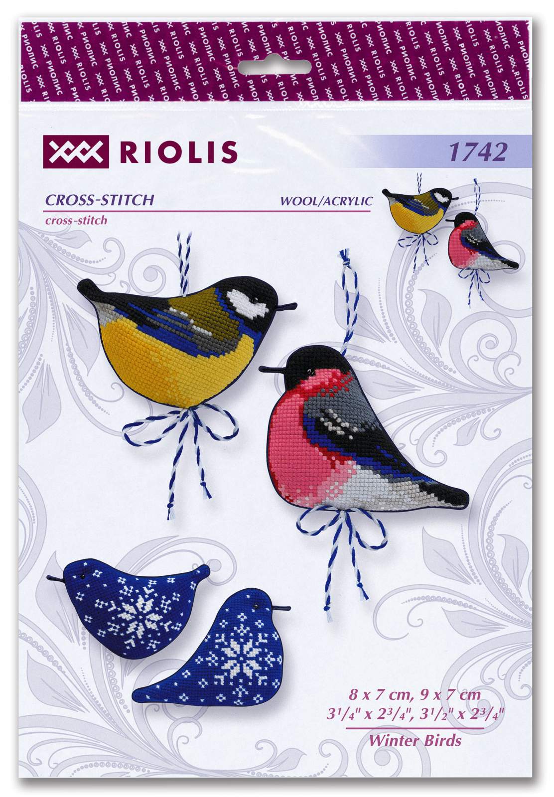 Celebrate the beauty of winter birds with the 1742 Winter Birds Cross-Stitch Kit from RIOLIS. This cheerful set includes three bird-shaped ornaments you can stitch and assemble. You’ll make a yellow and black great tit, a red-breasted bullfinch, and a bluebird with white snowflake patterns. Each bird hangs from a blue-and-white cord and has a matching bow for extra charm.